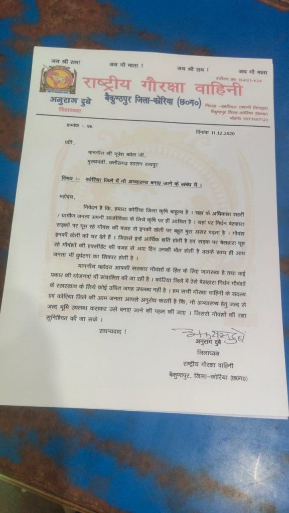 गत दिवस कोरिया जिले पहुंचे प्रदेश के मुखिया भूपेश बघेल को गौरक्षा वाहिनी के जिलाध्यक्ष अनुराग दुबे सहित सदस्यों के द्वारा कोरिया जिला बैकुंठपुर और भी आसपास के क्षेत्रों में निर्धन बेसहारा घूम रहे गौवंश को रखरखाव के लिए एक गौ अभ्यारण की मांग की गई । बताया गया कि मुख्यमंत्री के द्वारा महासमुंद, दुर्ग, कोडागांव, बिलासपुर व कांकेर जिला में गौ अभ्यारण बनाने की पहल की जा रही है उसी तर्ज पर हमारे कोरिया जिले में भी एक गौ अभिकरण की बहुत ही जरूरत है।