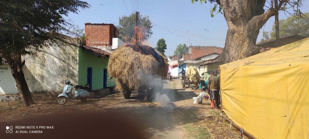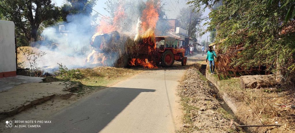 आग लगने के बाद देखते-देखते ट्राली में रखी पूरी पैरावट जलकर खाक