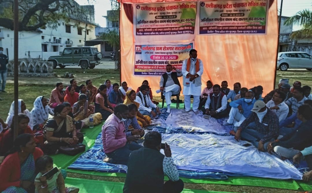 सचिव एवम रोजगार सहायक के हड़ताल को समर्थन देने पहुंचे पूर्व गृहमंत्री रामसेवक पैकरा