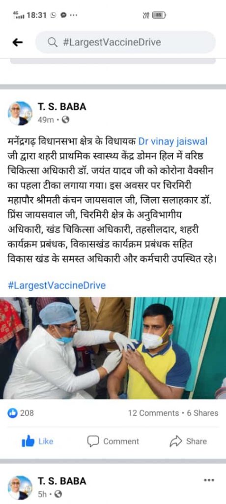 शहरी प्राथमिक स्वास्थ्य केंद्र डोमन हिल में कोविड-19 वैक्सीनेशन का का पहला चरण का टीका डॉक्टर जयंत यादव वरिष्ठ चिकित्सा अधिकारी चिरमिरी को पहला टीका लगाया गया। इस अवसर पर मनेंद्रगढ़ विधानसभा क्षेत्र के विधायक डॉ विनय कुमार जयसवाल और और चिरमिरी महापौर श्रीमती कंचन जायसवाल और जिला से जिला सलाहकार डाॅ प्रिंस जायसवाल और अनुविभागीय अधिकारी खडगवा पी वी खेज और साथ में खंड चिकित्सा अधिकारी, चिरमिरी क्षेत्र के तहसीलदार एवं शहरी कार्यक्रम प्रबंधक एवं विकासखंड कार्यक्रम प्रबंधक विकास खंड के समस्त अधिकारी और कर्मचारी उपस्थित थे ।