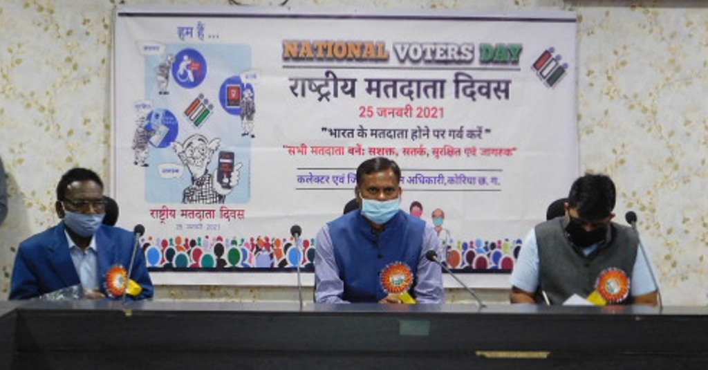 भारत निर्वाचन आयोग के दिशा निर्देशों के अनुरूप कोरिया जिले में प्रत्येक वर्ष की भांति इस वर्ष भी 25 जनवरी को राष्ट्रीय मतदाता दिवस के रूप मे मनाया गया। 11वें राष्ट्रीय मतदाता दिवस का मुख्य कार्यक्रम कलेक्ट्रोरेट स्थित सभाकक्ष में सम्पन्न हुआ। इस अवसर पर मुख्य अतिथि श्री शिवदयाल पैकरा, सेवानिवृत्त प्राचार्य, कलेक्टर एवं जिला निर्वाचन अधिकारी एसएन राठौर, मुख्य कार्यपालन अधिकारी जिला पंचायत एवं अध्यक्ष, जिला स्वीप समिति कुणाल दुदावत, अपर कलेक्टर सुखनाथ अहिरवार, उप जिला निर्वाचन अधिकारी ज्ञानेंद्र सिंह ठाकुर, डिप्टी कलेक्टर सहित अधिकारी-कर्मचारी तथा नवीन युवा मतदाता उपस्थित रहे।