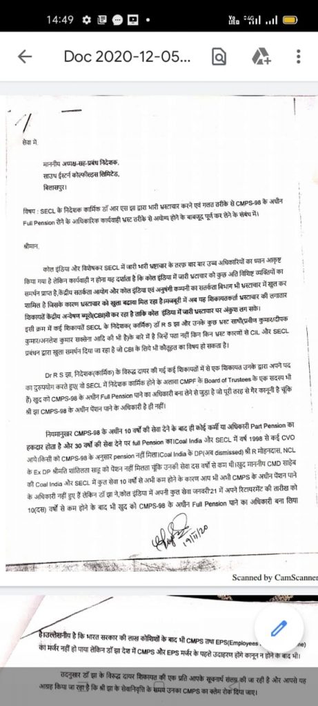 शिकायतकर्ता ने कहा कि एसईसीएल मुख्यालय बिलासपुर में पदस्थ निदेशक (कार्मिक) डॉ.