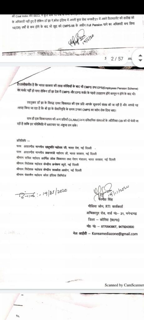 सतर्कता आयोग एवं कोल इंडिया के चेयरमेन को भी प्रेषित की है।