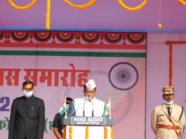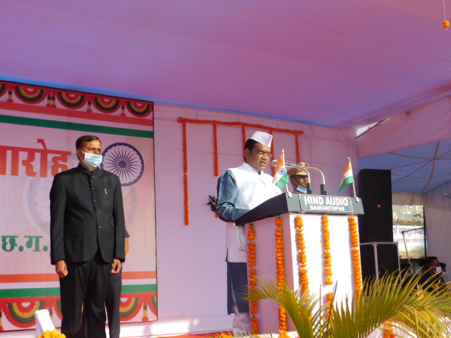 मुख्यमंत्री श्री बघेल के प्रदेष की जनता के नाम प्रेषित संदेश का वाचन करते हुए मुख्य अतिथि श्री बंजारे ने कहा कि हमारा छत्तीसगढ़ महान स्वतंत्रता सेनानियों और संविधान निर्माताओं की आशाओं के अनुरूप सद्भाव और समरसता के रास्ते पर अडिग रहा है। उन्होंने विकास के छत्तीसगढ़ मॉडल की सफलता का उल्लेख करते हुए आदिवासी अंचलों में स्थानीय नेतृत्व को सम्मान और अधिकार देने के लिए बस्तर, सरगुजा तथा मध्य क्षेत्र विकास प्राधिकरणों में अध्यक्ष और उपाध्यक्ष की नियुक्ति, 7 से बढ़ाकर 52 लघु वनोपजों की समर्थन मूल्य पर खरीदी, सामुदायिक वन अधिकार पत्र तथा सामुदायिक वन संसाधन पत्र, समर्थन मूल्य पर धान खरीदी, राजीव गांधी किसान न्याय योजना, गोधन न्याय योजना, स्वामी आत्मानंद इंग्लिष मीडियम स्कूल, छत्तीसगढ़ खेल विकास प्राधिकरण तथा मुख्यमंत्री कौषल उन्नयन योजना के बारे में बताया। इसके साथ ही प्रदेष के चहुंमुखी विकास में अपना योगदान देती सिंचाई परियोजनाओं, मनरेगा, विभिन्न सड़क योजनाओं, मुख्यमंत्री हाट बाजार क्लिनिक योजना, शहरी स्लम स्वास्थ्य योजना, सुपोषण अभियान एवं सार्वभौम पीडीएस योजना का उल्लेख किया।
