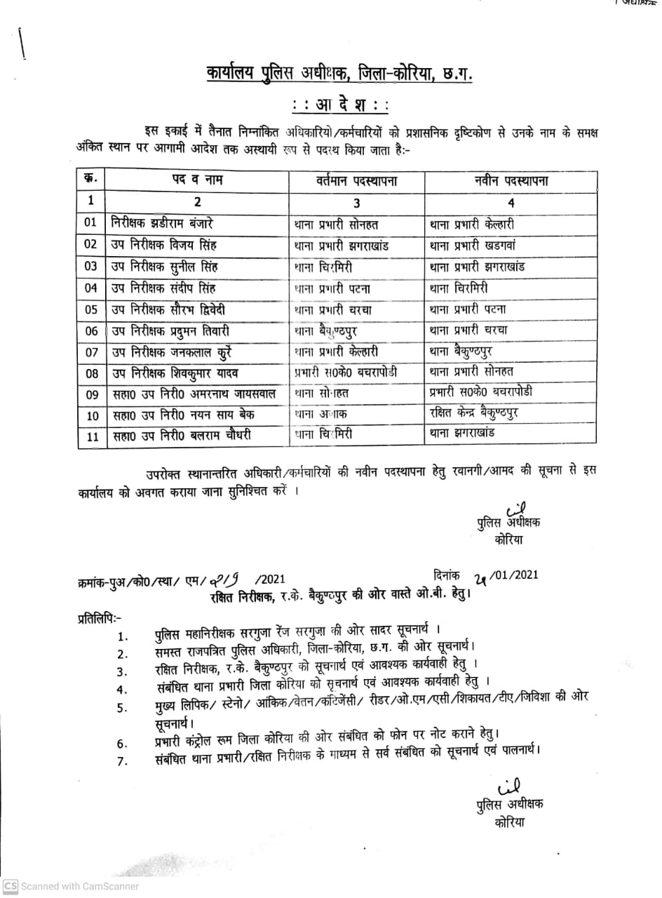 तहकीकात न्यूज @ वेब डेस्क . बैकुन्ठपुर कोरिया जिले में बड़े पैमाने पर थानों में बडे पैमाने पर फेर बदल करते हुए जिले के पुलिस [Read more…]