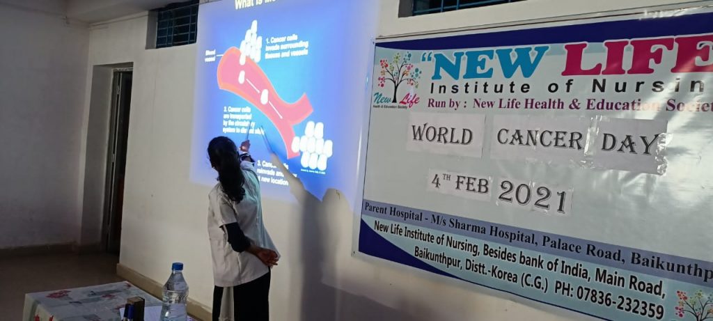 ”न्यू लाइफ“ हेल्थ एण्ड एजुकेषन सोसायटी द्वारा न्यू लाइफ इंस्टिट्यूट आॅफ नर्सिंग में बी.एस.सी. नर्सिंग एवं जी.एन.एम. छात्र छात्राओ के द्वारा 04 फरवरी को विष्व कैंसर दिवस के उपलक्ष्य में छात्र- छात्राओं द्वारा जिला चिकित्सालय में कैंसर दिवस के बारे में स्वास्थ षिक्षा दी गई। छात्राओं के द्वारा इस वर्ष के थीम “आई एम एण्ड आई विल“ के तहत कैंसर के बीमारी के बारे में लोगों को जागरूक करने और कैंसर के लक्षण और बचाव के बारे में जानकारी देने के मकसद से विष्व कैंसर दिवस मनाया गया। साथ ही संस्था षिक्षिका मिस पूनम के द्वारा कार्यषाला का आयोजन किया गया। इस साल विष्व कैंसर दिवस की थीम है “मै हू और मै रहूंगा”। ये थीम वर्ष 2019 से 2021 तक 3 वर्ष के लिए रखी गयी है, जो इस वर्ष भी कायम है।