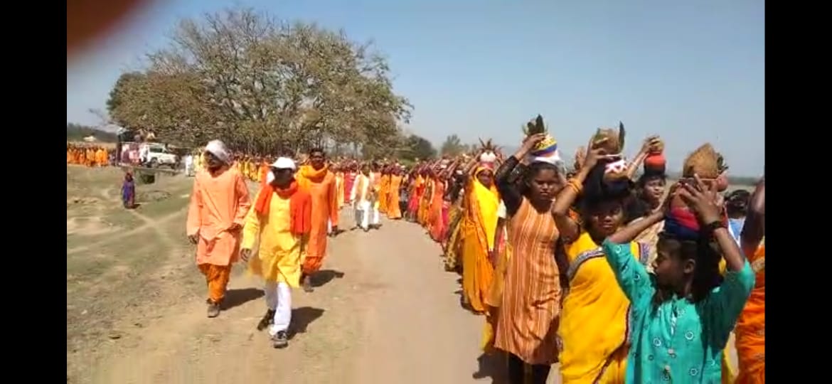 श्रीमद् भागवत सप्ताह ज्ञान यज्ञ शुभारंभ कलश यात्रा सैकड़ों भक्त जनों के द्वारा निकाली गई कथा श्री कृष्ण राधे की झांकी