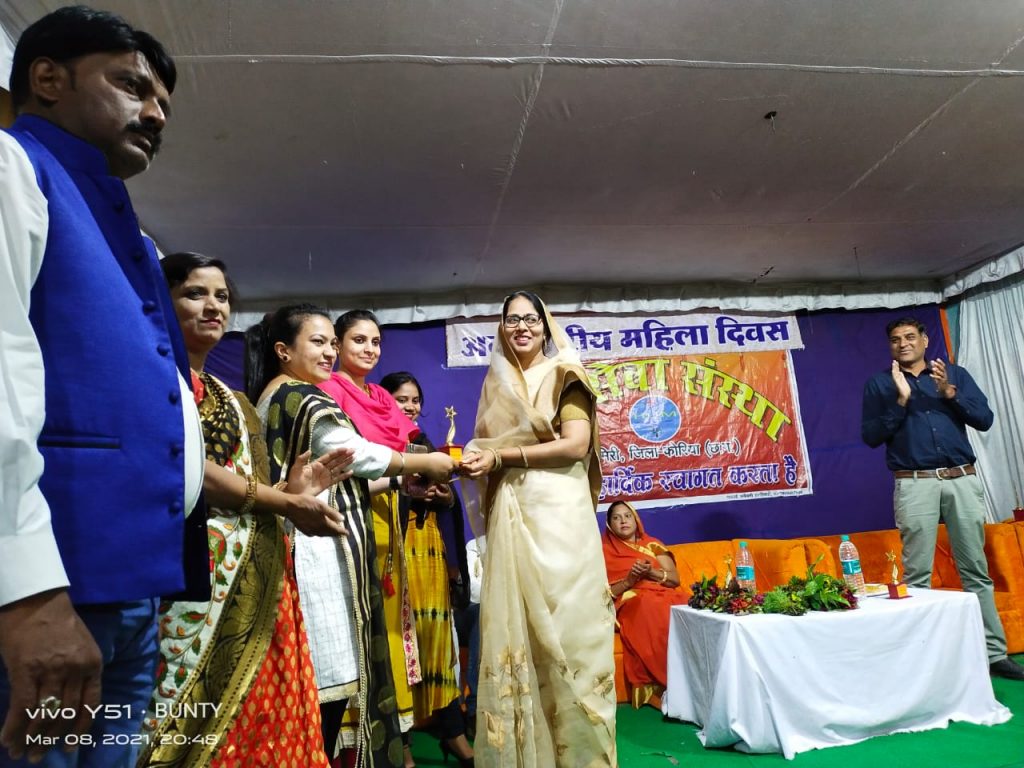 सुनीता खटीक जिनके 20 वर्ष पूर्व पति के स्वर्गवास के बाद अपने 5 बच्चों के साथ परिवार का भरण पोषण कर ngo के माध्यम से अपनी अलग पहचान बनाने वाली को पत्रकारिता में नूरजहाँ खातून व कोरोना काल मे पूरे कॉरेन्टीन सेंटर में दिन रात एक कर के अपनी परवाह किये बिना अपना योगदान देने वाली महिला कु पूजा मेश्राम का चिकित्सा के क्षेत्र में डॉ स्मिता टोप्पो व अलग अलग क्षेत्र में कार्य कर रही 15 महिलाओं को सम्मान किया गया ।