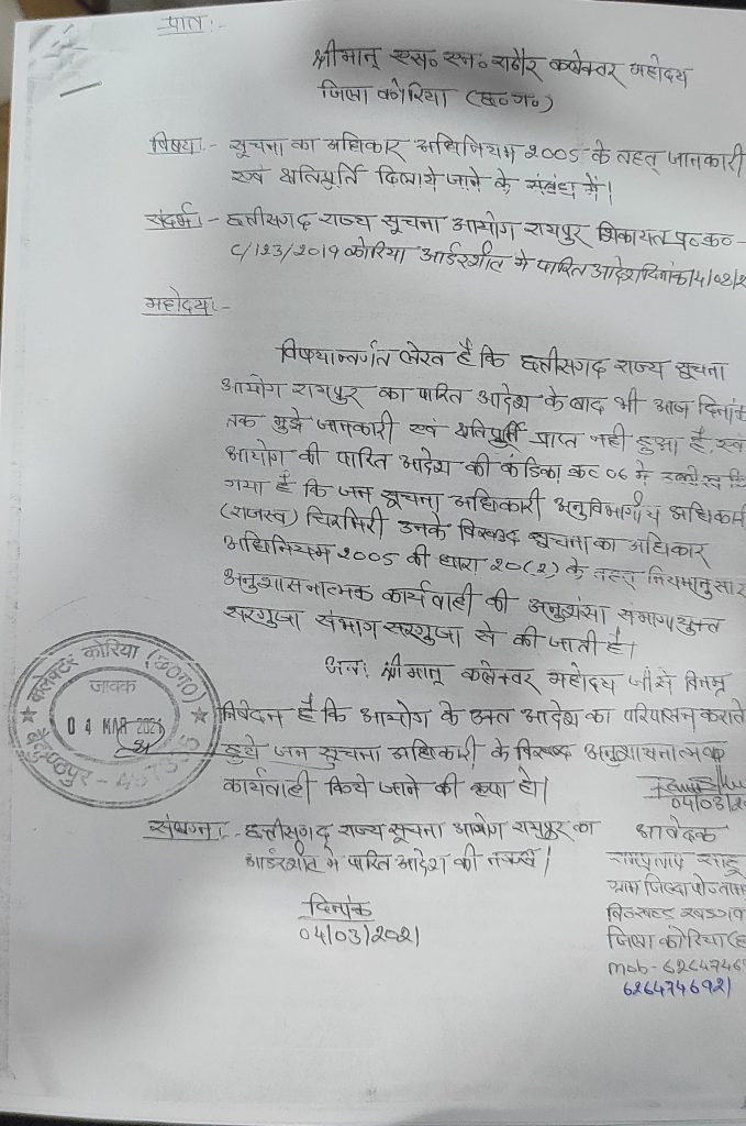 कोरिया में जन सूचनाधिकारी राज्य सूचना आयोज का आदेष उडा रहे माखौल, कलेक्टर से पालन कराने दी अर्जी