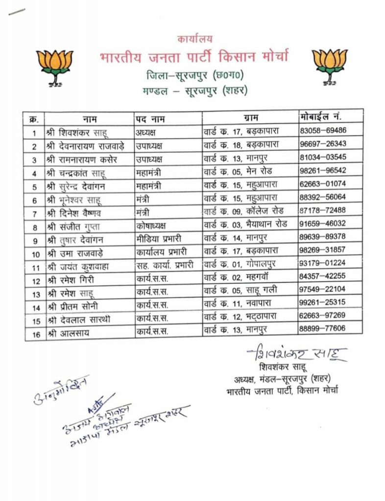 भारतीय जनता पार्टी किसान मोर्चा मंडल सूरजपुर शहर के अध्यक्ष शिव शंकर साहू ने किसान मोर्चा जिला अध्यक्ष रामकरण साहू के सहमति से एवं मंडल अध्यक्ष अजय अग्रवाल तथा मंडल प्रभारी मुरली मनोहर सोनी के अनुमोदन पश्चात अपने पदाधिकारी एवं कार्यसमिति सदस्यों की घोषणा की गई जिसमें उपाध्यक्ष देवनारायण राजवाड़े, रामनारायण कशेर महामंत्री चंद्रकांत साहू ,सुरेंद्र देवांगन मंत्री भुनेश्वर साहू , दिनेश वैश्णव कोषाध्यक्ष संजीत गुप्ता , मीडिया प्रभारी तुषार देवांगन कार्यालय प्रभारी उमा राजवाड़े सह कार्यालय प्रभारी जयंत कुशवाहा को बनाया गया है इसके अतिरिक्त कार्यसमिति सदस्य ,स्थाई आमंत्रित एवं विशेष आमंत्रित सदस्य के रूप में भी वरिष्ठ कार्यकर्ताओं को जगह दी गई l