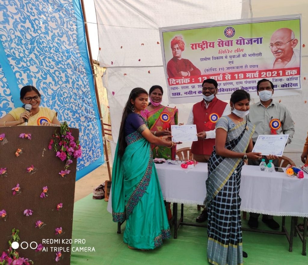 शासकीय नवीन कन्या महाविद्यालय की राष्ट्रीय सेवा योजना के बैनर तले 13 से 19 मार्च तक ग्राम शंकरपुर में आयोजित विशेष सात दिवसीय शिविर का समापन हो गया। समापन कार्यक्रम स्वामी विवेकानन्द एवं सरस्वती के छायाचित्र पर दीप प्रज्जवलित कर की गयी। सर्वप्रथम प्राचार्य सह कार्यक्रम अधिकारी डाॅ0रंजना नीलिमा कच्छप द्वारा स्वागत उद्बोधन के साथ शिविर प्रतिवेदन बताया कि ग्राम शंकरपुर के 55 परिवारों से मिलकर स्वयं सेवकों ने डोर-टू-डोर सर्वे में ग्रामीणों से मिलकर मुख्य रूप से स्वच्छता, कोविड-19, पर्यावरण सुरक्षा, शौचालय का प्रयोग, नशामुक्ति आदि के प्रति जागरूक करने का कार्य किया गया तथा दो बच्चों का बालिका समृध्दि योजना के अंतर्गत खाता खुलवाया गया एवं 4 हैंडपंप के आस पास स्वच्छता अभियान चलाया गया।