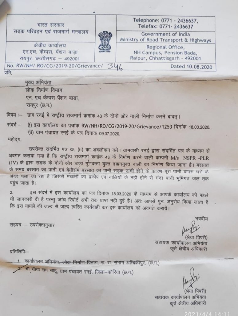 एक ग्रामीण ने गांव की जरूरतों को पूरा करने के लिए नेशनल हाईवे 73 के निर्माणाधीन सड़क पर नाली निर्माण नही होने पर इसकी मांग भारत सरकार सड़क परिवहन एवं राजमार्ग मंत्रालय से की है। जिसमें उन्हें सफलता प्राप्त हुई । जहां केंद्रीय सड़क परिवहन एवं राजमार्ग मंत्रालय के द्वारा लोक निर्माण विभाग के मुख्य अभियंता को पत्र लिखकर आदेशित किया गया है कि ग्राम रनई में राजमार्ग क्रमांक 43 के दोनों ओर नाली निर्माण कराया जाए। गौरतलब हो कि रनई निवासी सिया राम साहू के द्वारा 6 फरवरी 2020 को पत्र लिखकर रनई गांव के मध्य से गुजरने वाली नेशनल हाईवे क्रमांक 43 के दोनों ओर ग्रामीणों की जरूरत के लिए नाली निर्माण कराए जाने की मांग की उल्लेखित है कि गांव के लगभग 2.5 किलोमीटर दायरे में नाली निर्माण प्रस्तावित नहीं था। बावजूद इसके भी एक ग्रामीण के द्वारा अपनी मांग को विभिन्न माध्यमों सेे रखते हुए भारत सरकार के सड़क परिवहन मंत्रालय तक पहुंचाया गया । जिस पर केंद्रीय मंत्रालय द्वारा मांग पर गंभीरता पूर्वक विचार करने के उपरांत उसे पूरा किया गया। इस संबंध में मामले में आवेदन करने वाले सिया राम साहू का कहना है कि एनएच निर्माण के दौरान पटना के समीप नाली निर्माण कर लोगों को सुविधा दी जा रही थी वहीं पर रनई में ग्रामीणों को यह सुविधा नहीं मिल रही थी।