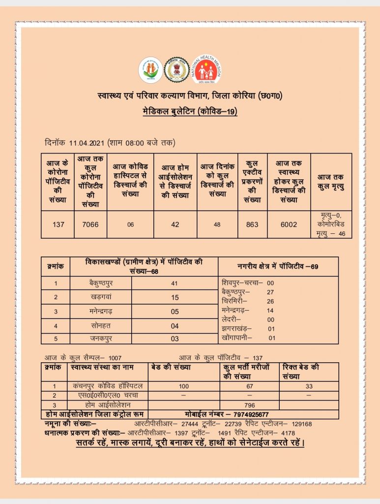 कोरिया जिले में पिछले 24 घंटे में 137 नए मामले सामने आए हैं। नए मामलों के बाद जिले में कोरोना की कुल संख्या 7066 हो गई है। पिछले 24 घंटे में 48 लोग कोरोना से ठीक होकर घर जा चुके है, उन्हें अस्पतालों से छुट्टी दी गयी है। वहीं कोरोना से अभी तक 6002 लोग ठीक हुए हैं, जिले में कुल एक्टिव मामले 863 है जिले में कोरोना वायरस संक्रमित से 46 लोगों की मौत हुई है। विदिति हो कि एक दिन पहले भी 136 केस सामने आये हैं।
