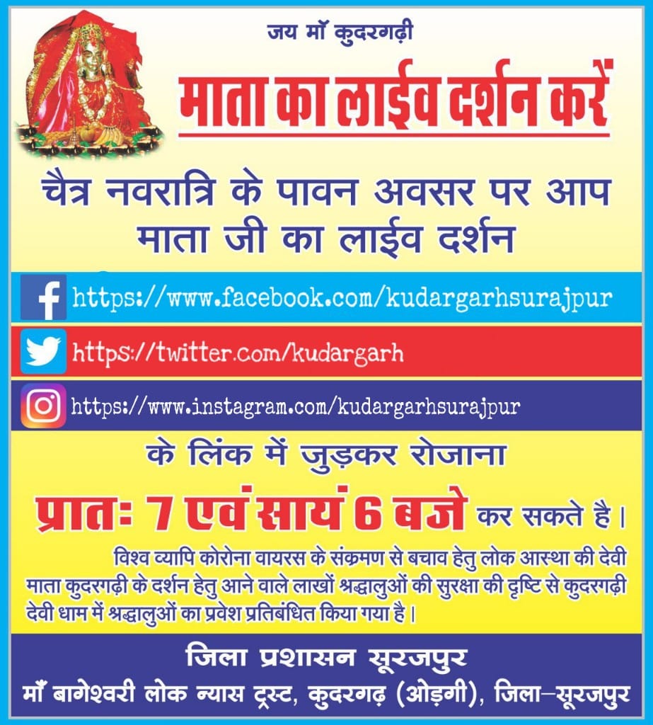 तहकीकात न्यूज @ अफजल मंसूरी . सूरजपुर रोजाना प्रातः 7ः00 बजे तथा संध्या के 6ः00 बजे कोरोना महामारी के संक्रमण को ध्यान में रखते हुए [Read more…]
