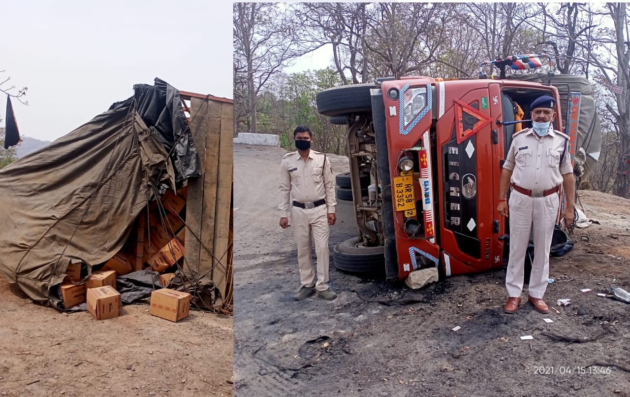 पलटी बिस्कीट से भरी ट्रक, मौके पर फौरन पहुंची सूरजपुर पुलिस