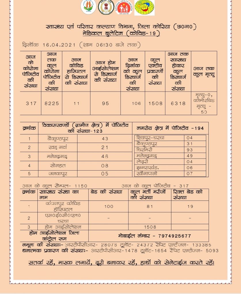 क्षेत्रों में कोरोना कि 123 पॉजिटिव तो ग्रामीण क्षेत्रों में भी 194 कोरोना संक्रमित पाये गये। जबकि जिले में 1150 लोगो की जाॅच की गई। जिसमें कोरोना का विस्फोट नजर आया बैकुंठपुर ग्रामीण में 43 एवं शहर में 31, चिरमिरी में 93 मनेंद्रगढ ग्रामीण में 48 एवं नगरी क्षेत्र में 49 , खडगवा में 21, सोनहत 8, जनकपुर में 5 एवं शिवपुर चरचा में 4 कोरोना संक्रमित सामने आए । इस दौरान जिले में किसी एक दिन में सबसे अधिक रिकार्ड 317 कोरोना सामने आए । मुख्य चिकित्सा एवं स्वास्थ्य अधिकारी कार्यालय से प्राप्त जानकारी के अनुसार जिले में सक्रिय मरीजों की संख्या बढ़कर 8225 तक पहुंच गई है। आज 108 लोगों को अस्पताल व होम आईसुलेषन से छुट्टी दे दी गई। अब तक 6318 लोग इलाज के बाद स्वस्थ हो चुके हैं। सक्रिय मरीजों की संख्या 1508 है, जिनका इलाज अस्पतालों और होम आइसोलेशन में किया जा रहा है। कोरोना से मौतों की संख्या 50 तक पहुंच गई है। मरीजों के इलाज के साथ-साथ टीकाकरण का कार्य भी निरंतर जारी है। कोरोना के मरीजों की पहचान के लिए आज 1150 नमूने भी एकत्र किए गये।
