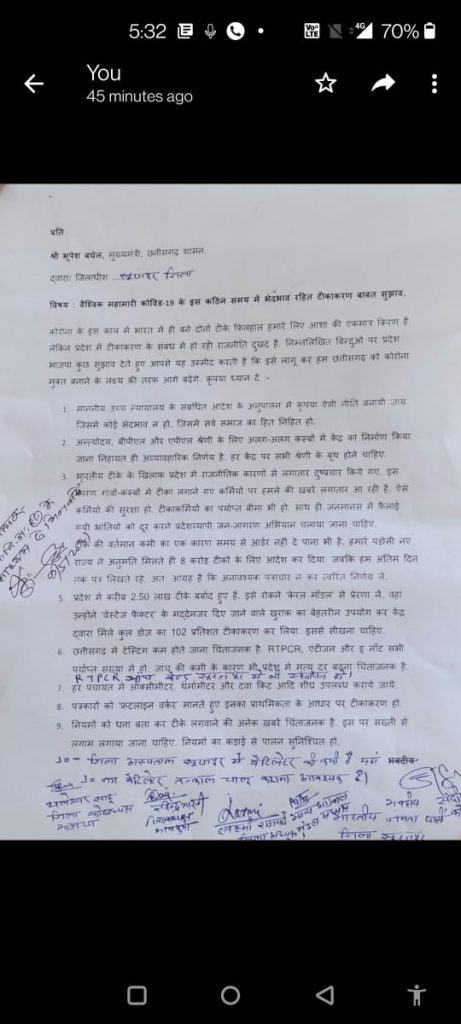 कोरोना वैश्विक महामारी के इस कठिन समय में प्रदेश में टीकाकरण को लेकर जो अनियमितताएं बरती जा रहीं हैं वो प्रदेश के जनता के हित के लिए निष्प्रभावी साबित हो रही हैं साथ ही कोरोना के इस काल में भारत में बने दोनों टीके फिलहाल हमारे लिए आशा की एकमात्र किरण है लेकिन प्रदेश के टीकाकरण के संबंध में हो रही राजनीति प्रदेशवासियों के लिए दुखद है इन्ही मुद्दों के लेकर जिला भाजपा के प्रतिनिधि मंडल ने कुछ मुख्य बिंदु पर प्रदेश के मुख्यमंत्री भूपेश बघेल जी के नाम कलेक्टर को ज्ञापन सौंपा जिसमे माननीय उच्च उच्च न्यायालय के संबंधित आदेश के अनुपालन में कृपया ऐसी नीति बनाई जाए जिसमें टीकाकरण में जनमानस को कोई असुविधा ना हो टीकाकरण में सर्व समाज का हित निहित हो ,व्यवहारिक निर्णय के आधार पर अंत्योदय बीपीएल और एपीएल श्रेणी के लिए सभी टीकाकरण केंद्र पर सभी श्रेणी के बूथ बनाए जाएं जो जन सामान्य के लिए सुविधाजनक हो| टीकाकरण का व्यापक प्रचार प्रसार हो तथा टीकाकरण अभियान में लगे स्वास्थ्य कर्मियों को पर्याप्त सुरक्षा दी जाए प्रदेश में करीब ढाई लाख टीके के डोज बर्बाद हुए हैं इसे रोकने के लिए प्रदेश सरकार को केरल मॉडल से प्रेरणा लेकर उसे अपनाना चाहिए| छत्तीसगढ़ में टेस्टिंग कम हो रही है आरटीपीसीआर एंटीजन और टू नॉट सभी पर्याप्त संख्या में जांच न होने के कारण मृत्यु दर बढ़ा हैं जो हमारे लिए चिंता का विषय बना हुआ है, कोरोना के आरटीपीसीआर जांच का एक केंद्र सुरजपुर में स्थापित हो तथा हर पंचायत में ऑक्सिमीटर थर्मामीटर और दवा किट जल्द से जल्द उपलब्ध कराया जाए|ज्ञापन में पत्रकारों को फ्रंटलाइन वर्कर मानते हुए इनका प्राथमिकता के साथ टीकाकरण कराए जाने की मांग की है | जिला चिकित्सालयसूरजपुर में वेंटिलेटर की कमी है यहां 10 नग वेंटिलेटर तत्काल चालू कराना अति आवश्यक है|इस दौरान भाजपा जिला कोषाध्यक्ष थलेश्वर साहू , जिला मंत्री संदीप अग्रवाल, मंडल अध्यक्ष अजय अग्रवाल, भाजयुमो जिलाध्यक्ष रविंद्र भारती ,महिला मोर्चा जिलाध्यक्ष लक्ष्मी राजवाड़े मौजूद रहे।