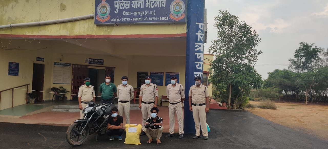 इसी तारतम्य में थाना प्रभारी भटगांव किशोर केंवट को गुरूवार 20 मई 2021 को मुखबीर से सूचना मिली कि बैजनाथपुर का सागर राजवाड़े एवं तेलगवां का मुकेश राजवाड़े काले रंग के टीव्हीएस अपाचे 160 सीसी बिना नंबर मोटर सायकल के बीच में एक प्लास्टिक की बोरी के अंदर गांजा रखकर बिक्री करने हेतु दतिमा चैक से होते हुए बैजनाथपुर जाने वाले है जिसकी सूचना से पुलिस अधीक्षक सूरजपुर राजेश कुकरेजा को अवगत कराए जाने पर उन्होंने थाना प्रभारी को सावधानीपूर्वक घेराबंदी लगाकर पकड़ने के निर्देश दिए।