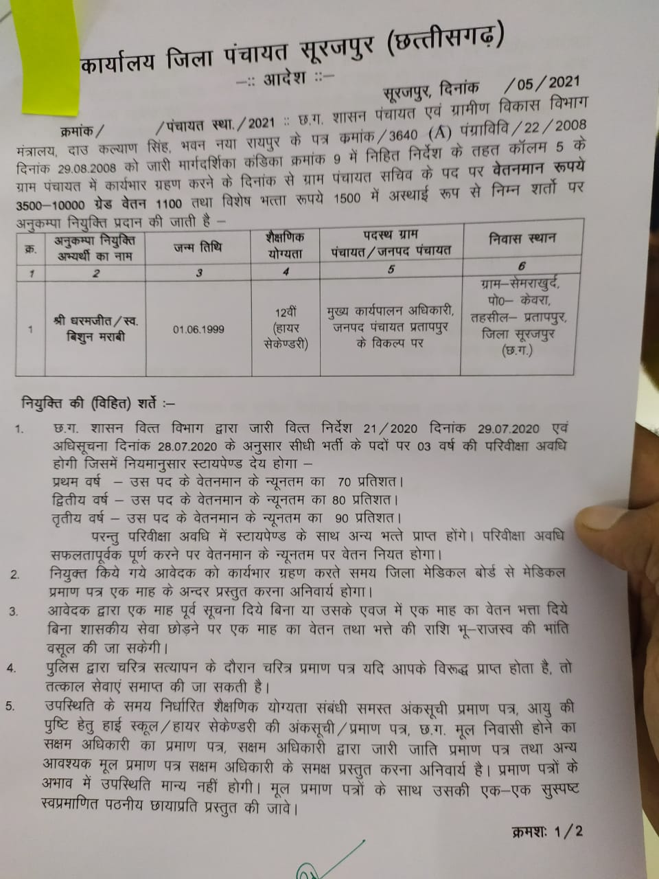शासकिय कर्मचारियों की मृत्यु होने पर रिक्त पदों पर अनुकम्पा नियुक्ति धरमजीत को मिली अनुकम्पा नियुक्ति