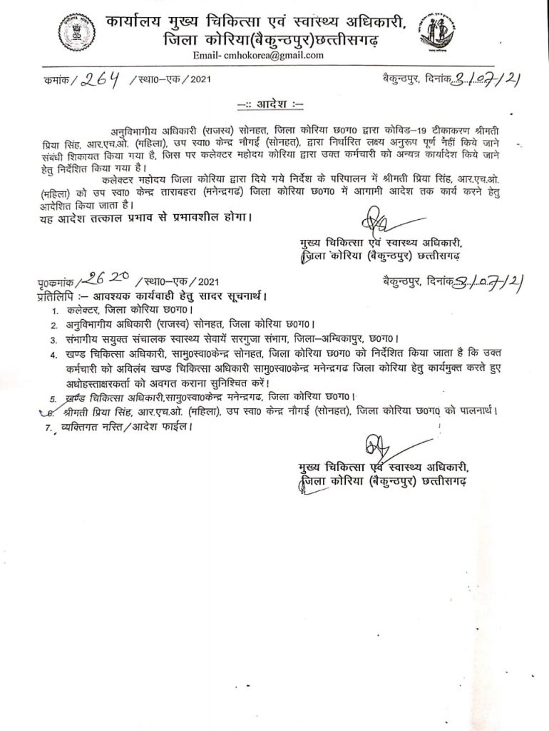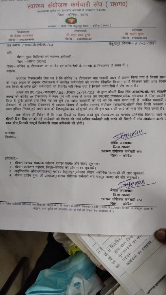 जो न्याय संगत नही है स्वस्थ्य विभाग के समस्त कर्मचारी ने अपने जान की परवाह किये बिना लोगो को कोविड 19 के संक्रमण से बचाने में अपनी सम्पूर्ण भागीदारी दी है। जिस पर इस प्रकार की कार्यवाही गलत एव तानासाह रवैया दर्षाता है। जिसके कारण कर्मचारीयो में रोष व्याप्त है । स्वास्थ्य सयोजक कर्मचारी संघ ने मांग किया है। प्रिया सिंह को उसके मूल पदस्थापना स्थान में यथावत रहने दिया जाए । नही करने पर धरना प्रदर्शन किया जाएगा ।