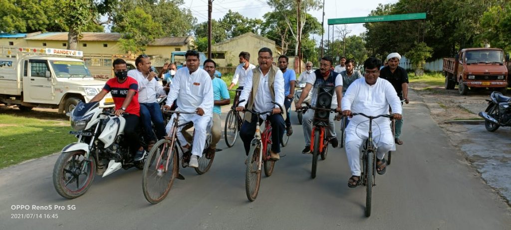 बढ़ती महंगाई के विरोध में 14 जुलाई दिन बुधवार को मनेंद्रगढ़ विधायक डॉ.विनय जायसवाल की अगुवाई में ब्लॉक कांग्रेस कमेटी चिरमिरी के नेतृत्व में ब्लॉक अध्यक्ष सुभाष कश्यप, सभापति गायत्री बिरहा, जिला प्रवक्ता प्रमोद सिंह,सांसद प्रतिनिधि प्रकाश तिवारी,शंकर रॉव महिला कांग्रेस की प्रदेश उपाध्यक्ष बबिता सिंह सहित नगर निगम के समस्त एमआईसी पार्षद निर्वाचित पार्षद एवं मनोनीत पार्षद की उपस्थिति में विशाल साईकल रैली निकल कर बढ़ते पैट्रोल डीजल एवं केंद्र सरकार की नीतियों के खिलाफ जम कर विरोध प्रदर्शन किया और केंद्र की बैठी सरकार को कोसते हुए यही अच्छे दिन है की परिभाषा से संबोधित किया । आम सभा को संबोधित करते हुए विधायक डॉ.विनय जायसवाल ने कहा की देश को करोना की मार के बाद दिनों-दिन बढ़ते जा रहे पेट्रोल-डीजल, रसोई गैस वृद्धि पर लगाम लगाकर जनता को राहत दी जाए।