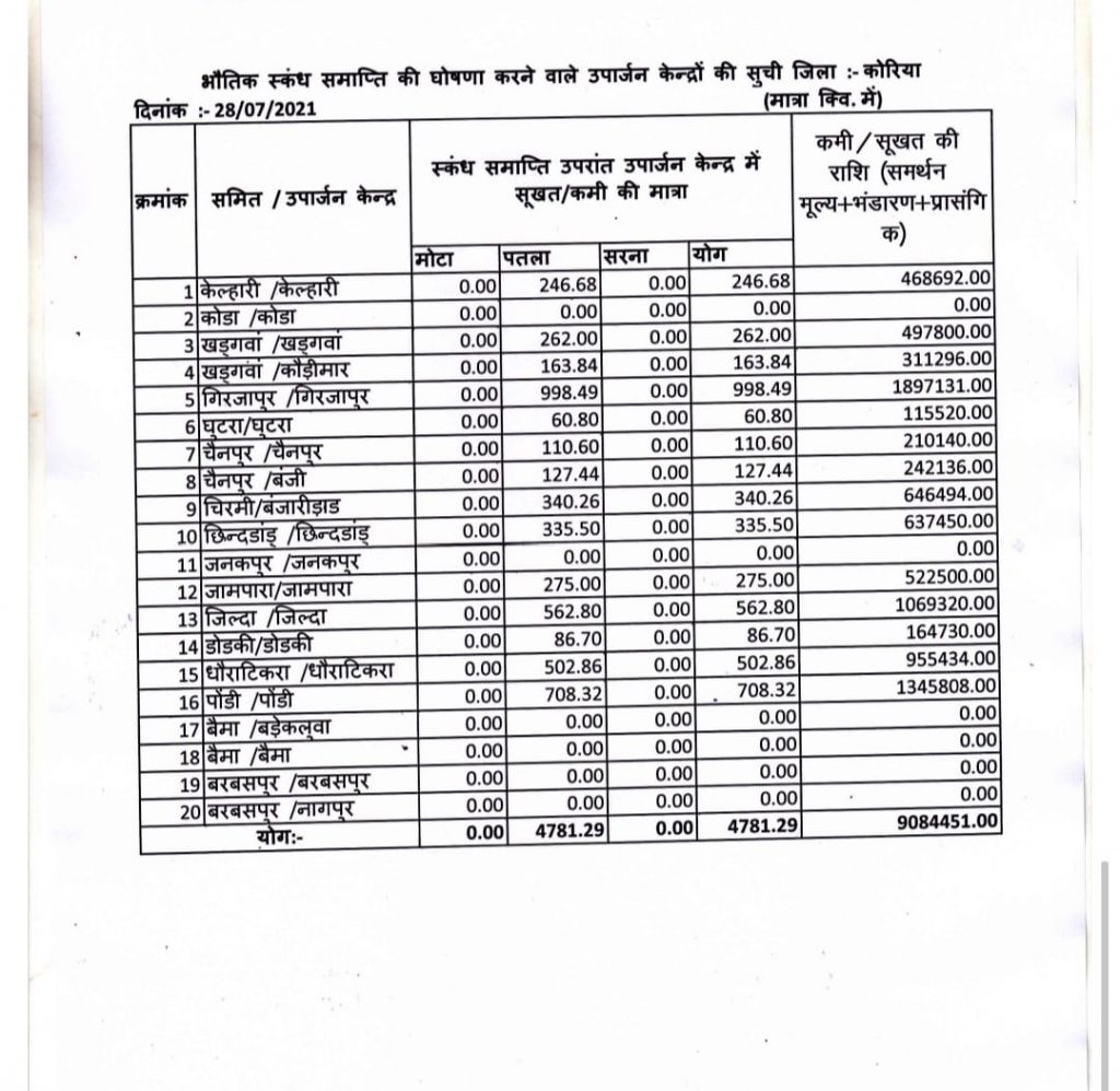 समिति के सरगुजा संभाग के अध्यक्ष प्रभाकर सिंह ने बताया कि कई समिति केंद्रों में अभी धान जाम पड़ा है वही बारिश के मौसम में धान भीग कर खराब हो रहा है जबकि धान का उठाव कराने के बजाए समिति केंद्र प्रभारियों पर एफआईआर दर्ज करने के निर्देश भी जारी किया गया है इस मामले में समिति केंद्र प्रभारियों ने सरकार से निष्पक्ष जांच कराने की मांग की है। लिहाजा खरीफ विपणन वर्ष 2020-21 में कोरिया जिले में धान का बंफर उत्पादन हुआ। समर्थन मूल्य के अलावा बोनस के कारण धान का रकबा भी बढ़ा था और खरीदी के पहले दिन से ही समितियों में धान की आवक भी शुरू हो गई थी। धान खरीदी पूर्ण होने के बाद समितियों से संग्रहण केंद्र से उठाव व कस्टम मिलिंग का काम चल रहा है। उपार्जन केंद्रों द्वारा खरीदे गए धान के मिलान और भौतिक सत्यापन के बाद जिले में अप्रत्याशित कमी सामने आई है।