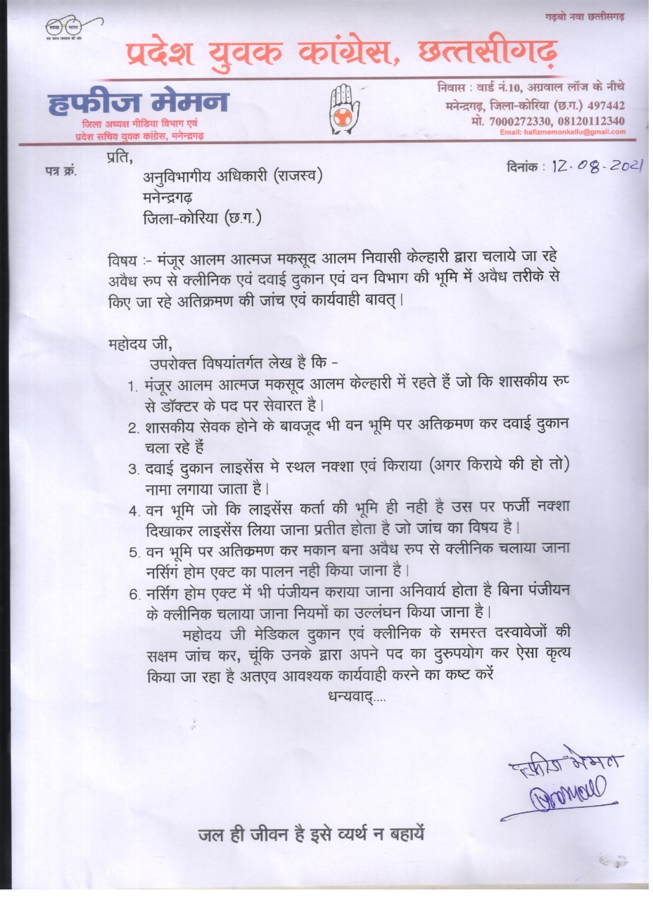 हाफिज मेमन ने एसडीएम को पत्र लिख केल्हारी में अवैध रूप से संचालित क्लीनिक पर कार्यवाई करने की मांग