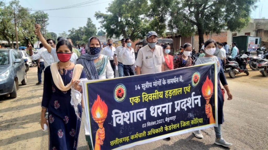 छ ग कर्मचारी अधिकारी फेडरेशन के आव्हान पर 3 सितंबर को कोरिया जिले के कर्मचारी अधिकारीयो के द्वारा अपनी 14 सूत्रीय मांगों को लेकर कलेक्टर कार्यालय कोरिया के सामने कलम बंद काम बंद के नारे के साथ हड़ताल किया गया एवं मुख्यमंत्री छ ग शासन के नाम कलेक्टर कोरिया को ज्ञापन सौंपा गया जिसमें जिले भर से भारी संख्या में अधिकारी कर्मचारी उपस्थित थे कलम बंद काम बंद हड़ताल संरक्षक ए पन्ना की अध्यक्षता में प्रारंभ हुआ मंच संचालन अशोक गुप्ता के द्वारा किया गया सरगुजा संभाग के सह संयोजक राजेंद्र सिंह ने बताया कि केंद्र के कर्मचारियों को 28ः महंगाई भत्ता दिया जा रहा है जबकि राज्य कर्मचारियों को मात्र 12ः ही महंगाई भत्ता दिया जा रहा है जो कि भेदभाव पूर्ण है प्रदेश के कर्मचारी अधिकारी एवं पेंशनरों को देय तिथि 19 जुलाई से 17ः सहित वर्तमान दर 28ः महंगाई भत्ता दिया जाए जिला संरक्षक शंकर सुमन मिश्रा ने कहा कि प्रदेश के कर्मचारियों के वेतन में भारी विसंगति उत्पन्न हो गई है जिस ओर राज्य शासन ध्यान नहीं दे रही है अतः जल्द से जल्द शिक्षक लिपिक एवं स्वास्थ्य संवर्ग के वेतन विसंगति निराकृत किया जाए पवन रुपौलिहा ने कहा कि हमें अपनी एकजुटता सक्रियता से संघर्ष करना होगा और अपने अधिकारों के प्रति जागरूक रहकर क्रांति की मशाल को जलाए रखना होगा तभी हम अपनी मंजिल को प्राप्त कर पाएंगे उसके पश्चात संयोजक विश्वास भगत ने कहा कि शासन के एमएलए एमपी को जब अपनी सुविधा पेशन बढ़ानी होती है तो एक स्वर में ध्वनि मत से प्रस्ताव पारित हो जाता है जबकि कर्मचारी की पीड़ा की ओर शासन का ध्यान नहीं जा रहा है पुरानी पेंशन योजना के अभाव में कर्मचारियों का भविष्य असुरक्षित है अतः पुरानी पेंशन योजना को जल्द से जल्द लागू किया जाए जो कि कर्मचारियों का जायज हक है पटवारी संघ से योगेश गुप्ता ने कहा कि सभी विभागों में पदोन्नति क्रमोन्नति समय मान लंबित है जल्द से जल्द इसका लाभ दिया जाए।