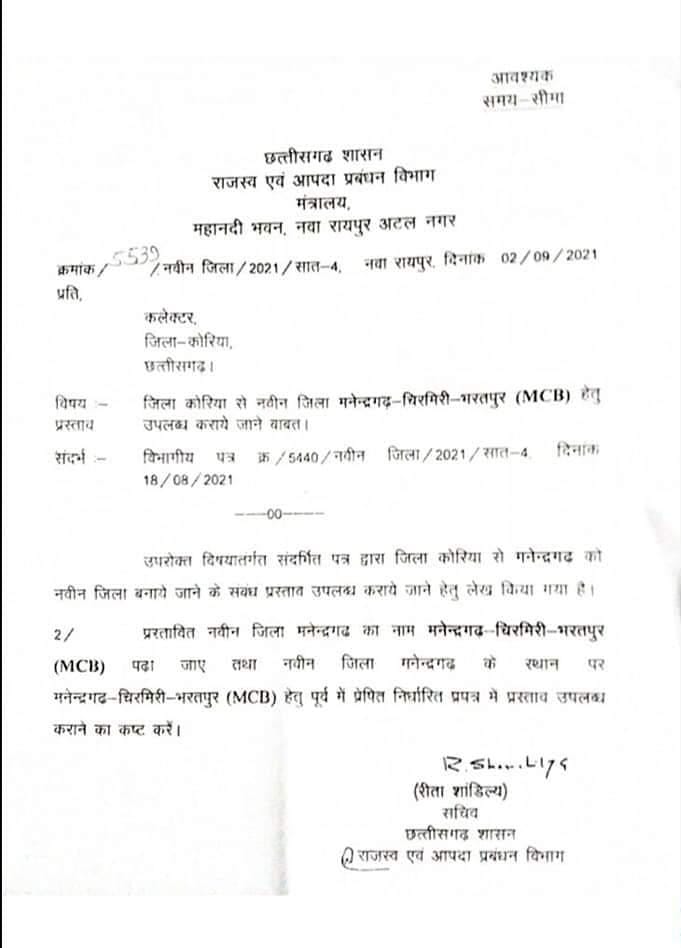 नवीन जिला मनेन्द्रगढ़ चिरमिरी भरतपुर( MCB) के नाम नोटिफिकेशन जारी ….