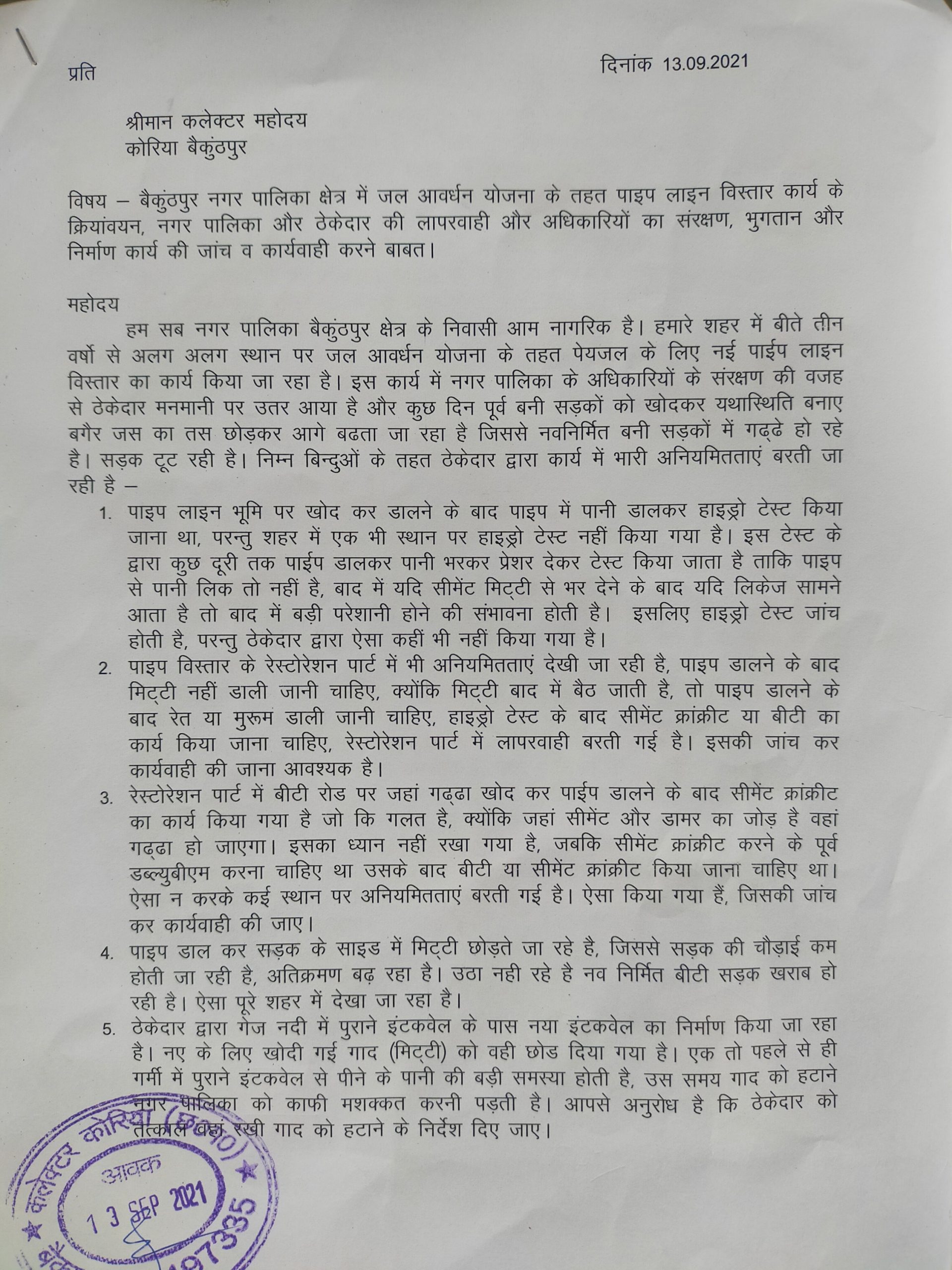 ठेकेदार के मनमाने कार्य की जांच के लिए लामबंद हुए शहर वासियों ने कलेक्टर को सौपा ज्ञापन