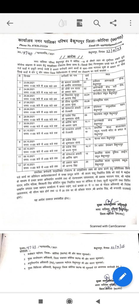 नगर पालिका परिषद बैकुंठपुर क्षेत्र में कोरोना वायरस के तीसरे लहर को ध्यान में रखते हुए संक्रमण को रोकने के लिए शत प्रतिशत टीकाकरण किए जाने का निर्णय लिया गया है। जिसके अनुसार बैकुंठपुर नगर पालिका अंतर्गत सभी वार्डों में कैंप लगाकर टीकाकरण कार्य किया जाएगा। नगरपालिका के कर्मचारियों मतदाता सूची के आधार पर वार्डों में डोर टू डोर जाकर संपर्क कर टीकाकरण का कराने का कार्य सुनिश्चित किया जाना तय किया है। इस संबंध में नगर पालिका बैकुंठपुर के मुख्य नगरपालिका अधिकारी मुक्ता सिंह चौहान ने जानकारी देते हुए बताया कि टीकाकरण अभियान 23 सितंबर गुरुवार से प्रारंभ किया जा रहा है। जिसमें 23 से 11 बजे से 4 बजे तक वार्ड क्रमांक 1 हररापारा आंगनबाड़ी केंद्र में कैंप का आयोजन किया जाएगा । जिसमें बलराज प्रजापति व आशीष जायसवाल की ड्यूटी लगाई गई है।