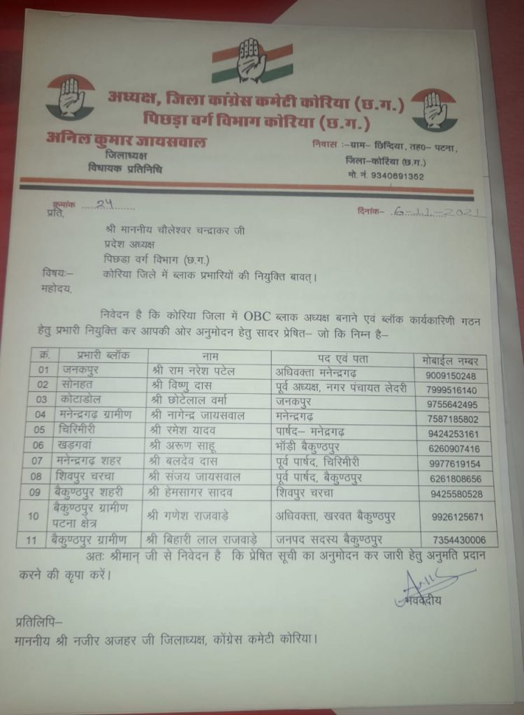 कोरिया पिछड़ा वर्ग के ब्लॉक अध्यक्षों की नियुक्ति व कार्यकारिणी गठन हेतु प्रभारियों