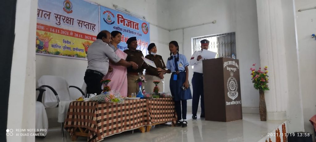 बाल सुरक्षा सप्ताह के समापन के अवसर पर स्कूली छात्र-छात्राओं को कोरिया पुलिस द्वारा सम्मानित करने का कार्यक्रम आयोजित किया गया। विदित हो कि 14 नवम्बर से बाल सुरक्षा सप्ताह का आयोजन किया गया है जिसमें कोरिया पुलिस द्वारा निबन्ध, रंगोली, चित्रकला एवं खेलकूद प्रतियोगिताओं का आयोजन विद्यालय स्तर पर किया गया जिसमें प्रथम, द्वितीय एवं तृतीय पुरस्कार भी रखा गया।