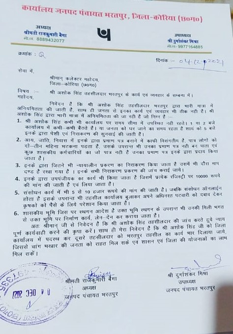 कोरिया जिले के भरतपुर जनपद के अध्यक्ष एवं उपाध्यक्ष ने कोरिया कलेक्टर श्याम धावडे को पत्र के माध्यम से भरतपुर तहसीलदार के व्यवहार को लेकर लिखित शिकायत का पत्र सौंपा है। जिसमें कहा गया है कि भरतपुर तहसीलदार के द्वारा भारी मात्रा में अनियमितता की जा रही है साथ ही जनता से इनका कार्य के साथ व्यवहार भी ठीक नहीं है । पत्र में अनियमितता के संबंध में बिंदुवार जानकारी देते हुए कहा गया है कि ये कार्यालय समय सीमा में उपस्थित नहीं रहते 1 से 2 के बीच इनके द्वारा पेश एवं निराकरण की सुनवाई की जाती है। आय, जाति एवं निवास प्रमाण पत्र बनाने में काफी विसंगति है जिससे पात्रों को 2 से 3 महीना तक भटकना पड़ रहा है ।