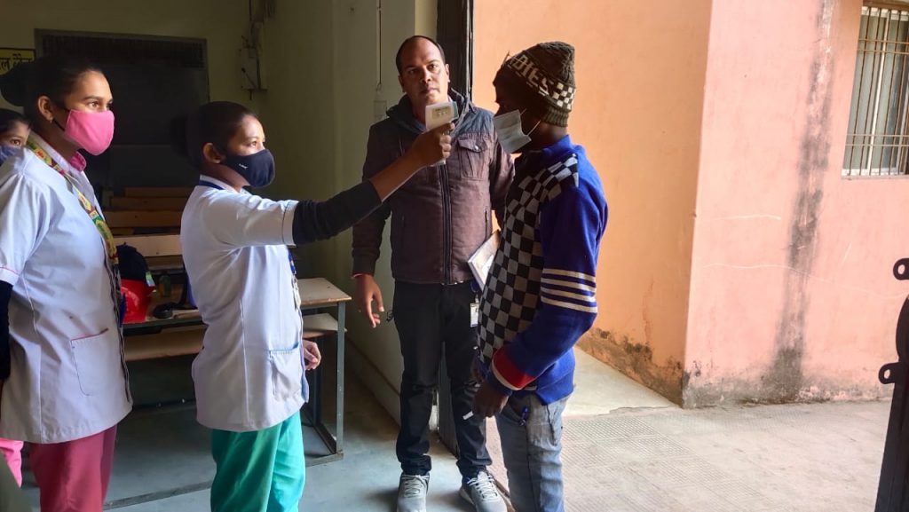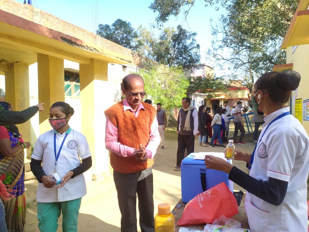आज जिले में कोरोना वायरस टीका अभियान भी चलाया जा रहा है इस दौरान मतदान केंद्रों में भी पहुॅच रहे लोग जिन्हें टीका नहीं लगा है उन्हें टीका भी लगाया गया। दूसरी ओर मतदान केंद्रों में कोरोना गाइडलाइन का पालन कराने के लिए जिला प्रशासन के द्वारा न्यू लाइफ ऑफ नर्सिंग की 64 छात्रो की ड्यूटी स्वास्थ्यकर्मीयो संग बैकुंठपुर के सभी 20 मतदान केंद्रों में लगाई गई है । जहा उनके द्धारा सुबह से मतदान केन्द्रो पर आ रहे मतदाताओ के तापमान मापक यंत्रो के साथ सोसल डिस्टेंसिंग और मास्क व हेंड सेनेटाईजर तकका पूरा ध्यान रखा जा रहा था।