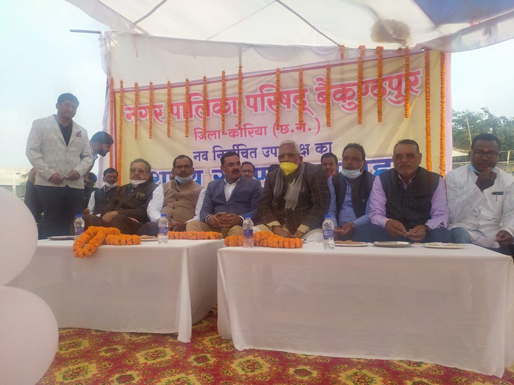 नवनिर्वाचित कांग्रेसी पार्षदों एवं अध्यक्ष-उपाध्यक्ष का शपथ ग्रहण कार्यक्रम बैकुंठपुर एवं शिवपुर-चरचा में आयोजित किया गया। इस दौरान बैकुन्ठपुर के कुमार गार्डन में कां्रगेस के पार्षद और उपाध्यक्ष अशीश यादव, अन्नपूर्णा सिंह, साधना जायसवाल, लवी गुप्ता, संजय जायसवाल, सुनिल गुप्ता आदि पार्षदो ने षपथ लिया। वही पर षिवपुर चरचा में नगर पालिका अध्यक्ष लालमूनि यादव सहित कां्रगेस के सभी पार्षदो ने षपथ लिया। कार्यक्रम में चुनाव प्रभारी दीपेंद्र मिश्रा, जेपी श्रीवास्तव, नजीर अजहर, योगेश शुक्ला, वेदांती तिवारी, प्रदीप गुप्ता, अषोक जायसवाल, राम कृष्ण साहू व इंटक नेता गोपाल नारायण सिंह शामिल रहे।