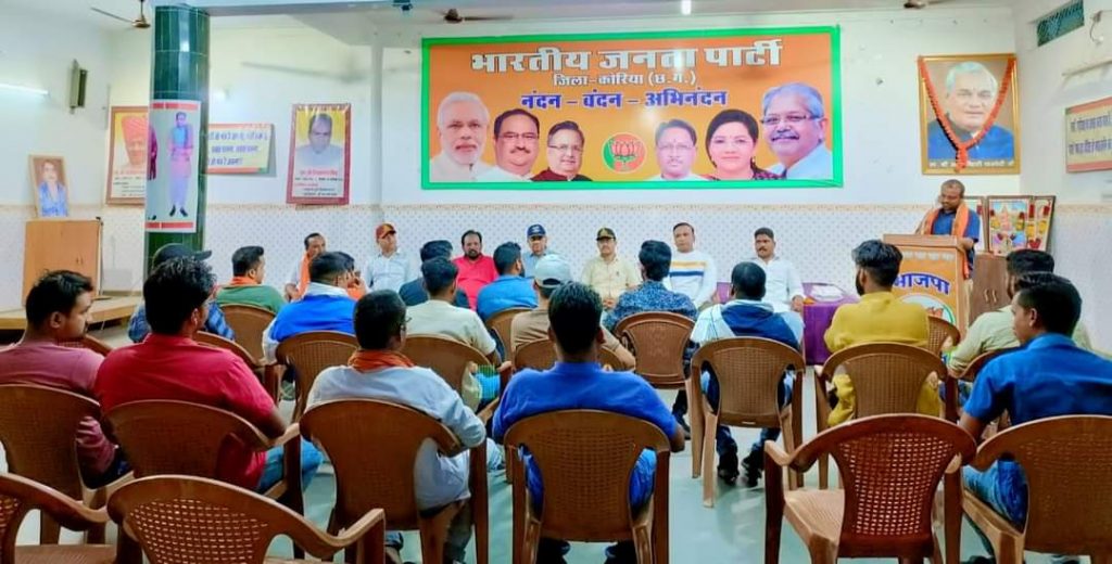 भाजयुमो के राष्ट्रीय अध्यक्ष तेजस्वी सूर्या एवं प्रदेश अध्यक्ष अमित साहू के निर्देशानुसार युवा मोर्चा कोरिया के द्वारा सामाजिक न्याय पखवाड़ा के तहत् पूर्व सैनिकों का अभिनंदन समारोह का आयोजन भाजपा कार्यालय बैकुंठपुर में किया गया। कार्यक्रम के दौरान युवा मोर्चा के कार्यकर्त्ताओं के द्वारा पू र्व सैनिकों को पुष्पमाला पहनाकर श्रीफल व गमछा भेंटकर सम्मानित किया गया।