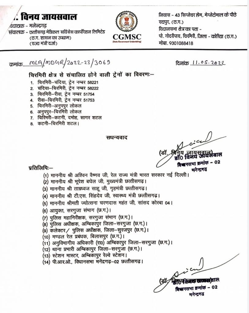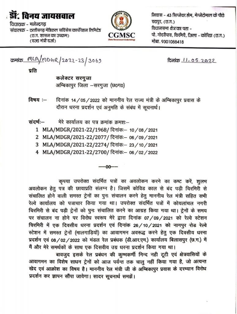 अपितु आज दिवस तक नातो रेल प्रबंधन इस ओर गभीर हुआ और ना ही केंद्र की गूंगी बहरी सरकार ने कोई पहल की अपने क्षेत्र में रेल सुविधा को बहाल करने के लिए विधायक डॉक्टर विनय जयसवाल के द्वारा देश की राजधानी दिल्ली में जा कर विरोध प्रदर्शन की तैयारी बनाई जा रही थी । परंतु आगमी दिवस पर केंद्रीय रेल मंत्री स्वयं एक दिवसीय दौरे पर अंबिकापुर शहर आने की जानकारी मिलने के बाद मनेंद्रगढ़ विधायक डॉ.जायसवाल इस बड़ी समस्या को लेकर अपने समर्थकों की मौजूदगी में केंद्रीय मंत्री के आयोजन स्थल पर उपस्थित होकर विरोध प्रदर्शन करते हुए उन्हें ज्ञापन सौपेंगे । विधायक जायसवाल ने इस विरोध प्रदर्शन में शहर वासियों से अपील करते हुए कहा है की आप सभी अधिक से अधिक संख्या में अंबिकापुर चलकर चिरमिरी की ट्रेनों को पुन: चालू करने हेतु अपना विरोध दर्ज कराये और हमारा सहयोग करें ।