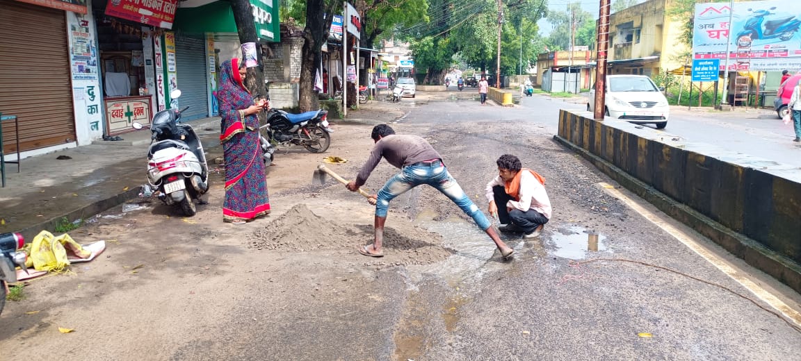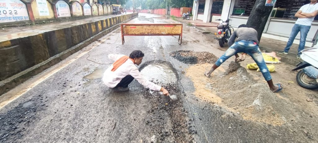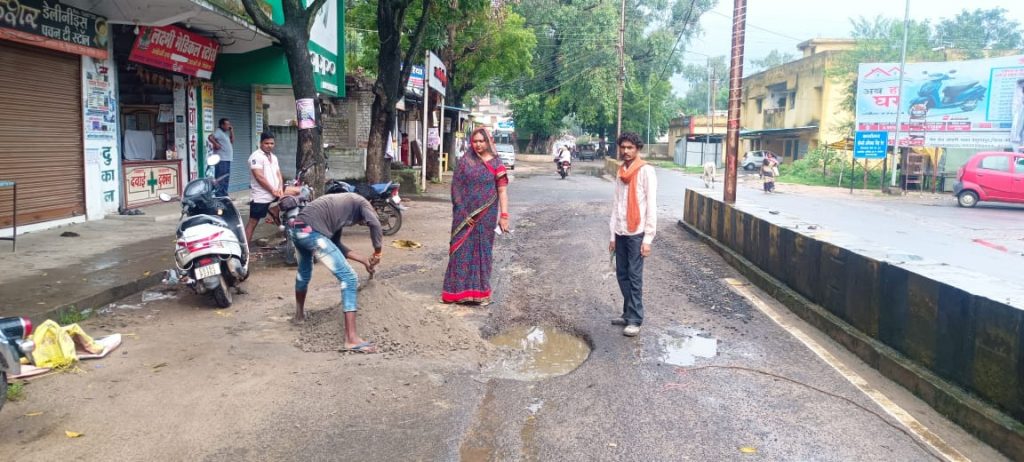 नगर पालिका परिषद बैकुंठपुर के नेता प्रतिपक्ष अन्नपूर्णा प्रभाकर सिंह के द्वारा लगातार नगर के वार्ड की साफ सफाई पर विशेष ध्यान दिया जा रहा है ज्ञात हो कि जनपद परिसर के पास गौरव पथ में पानी का भराव रहता है जिससे डामर रोड में एक बड़ा सा गड्ढा हो गया था दो पहिया वाहन सवारों को आए दिन गिरकर चोटिल हो रहे थे स्थानीय लोगों के द्वारा नेता प्रतिपक्ष अन्नपूर्णा प्रभाकर सिंह को समस्या से अवगत कराया गया नेता प्रतिपक्ष अन्नपूर्णा प्रभाकर सिंह के द्वारा तत्काल सीमेंट बालू गिट्टी और लेबर लेकर जनपद परिसर की दुकान के पास बने गौरव पथ में बड़े से गड्ढे को स्वयं खड़े होकर भरवाया गया इस गौरव पथ मैं भीड़ भाड़ हमेशा बना रहता है क्योंकि बगल में ही जिला चिकित्सालय एवं सिटी कोतवाली हैऔर इसी रोड से ग्रामीण क्षेत्रों के लोगों का आना जाना है अन्नपूर्णा प्रभाकर सिंह के द्वारा स्वयं के खर्चे से गौरव पथ में बड़े से गड्ढे का सुधार करवाने पर स्थानीय जन एवं आम लोगों के द्वारा धन्यवाद ज्ञापित किया गया