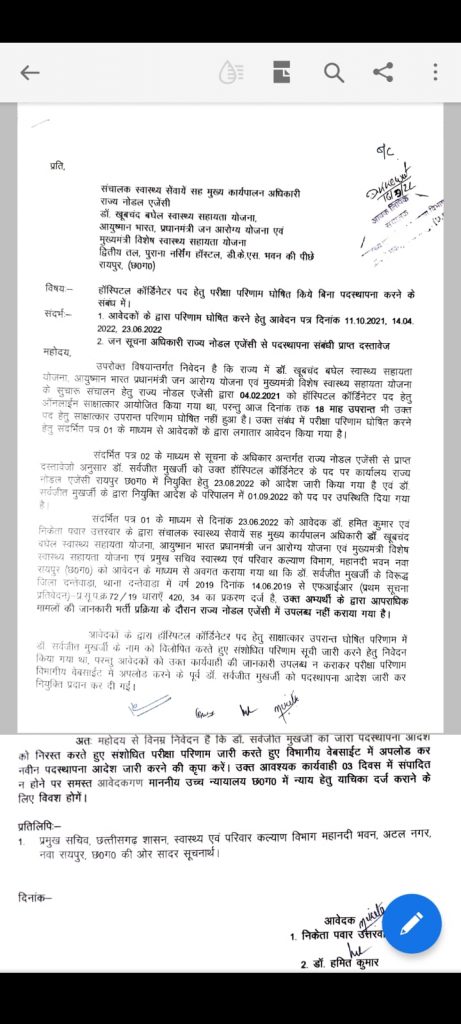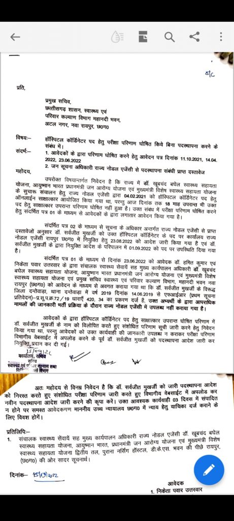 आवेदकों के द्वारा हॉस्पिटल कॉर्डिनेटर पद हेतु साक्षात्कार उपरांत घोषित परिणाम में लाभार्थी के नाम को विलोपित करते हुए संशोधित परिणाम सूची जारी करने हेतु निवेदन किया गया है। परंतु आवेदकों को कार्यवाही की जानकारी आज तक उपलब्ध न कराकर परीक्षा परिणाम की वेबसाइट में अपलोड करने के पहले ही डॉ. सर्वजीत मुखर्जी को पदस्थापना आदेश जारी कर नियुक्ति दे दी गई है।