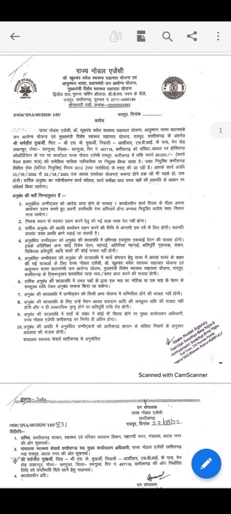 राज्य नोडल एजेंसी से प्राप्त दस्तावेजों के अनुसार डॉ सर्वजीत मुखर्जी को हॉस्पिटल कोऑर्डिनेटर के पद पर कार्यालय राज्य नोडल एजेंसी रायपुर में नियुक्ति हेतु 23/08/2022 को आदेश जारी किया गया एवं नियुक्ति आदेश के निर्देश पर दिनॉक 01/09/2022 को पद पर नियुक्ति दे दिया गया । दिनाक 23/06/2022 को मामले में शिकायतकर्ता डॉ. हमित कुमार, व निकेता पवार उत्तरवार के द्वारा संचालक स्वास्थ्य सेवाएं सह मुख्य कार्यपालन अधिकारी डॉ. खूबचंद बघेल स्वास्थ्य सहायता योजना, आयुष्मान भारत प्रधानमंत्री जन आरोग्य योजना एवं मुख्यमंत्री विशेष स्वास्थ्य सहायता योजना और प्रमुख सचिव स्वास्थ्य एवं परिवार कल्याण विभाग को पत्र के माध्यम से अवगत कराया गया था कि डॉ. सर्वजीत मुखर्जी के विरुद्ध जिला दंतेवाड़ा थाना में वर्ष 2019 दिनाक 14/06/2019 से एफ.आई.आर 420, 34 के घाराओ में प्रकरण दर्ज है । मामले में लाभार्थी के द्वारा अपराधिक मामले की जानकारी भर्ती प्रक्रिया के दौरान नोडल एजेंसी में उपलब्ध नहीं कराये जाने की बात भी सामने आ रही है।