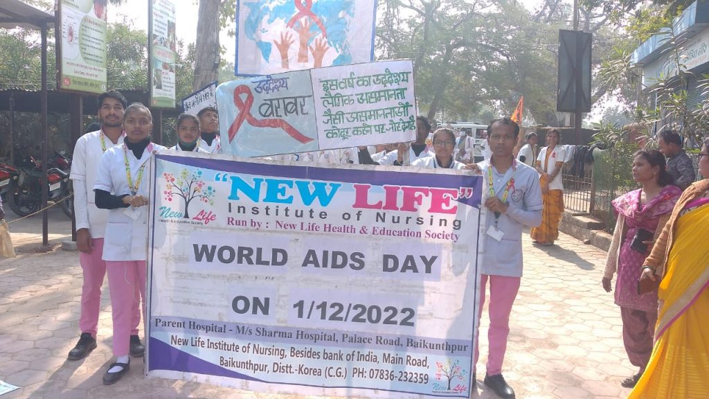 न्यू लाईफ हेल्थ एण्ड एजुकेषन सोसायटी द्वारा संचालित ‘‘न्यू लाईफ‘‘ इंस्टीट्यूट ऑफ नर्सिंग में छात्र-छात्राओ के द्वारा 1 दिसम्बर को जिला चिकित्सालय बैकुण्ठपुर में विष्व एड्स दिवस पर जन जागरूक रैली का आयोजन किया गया। जिसमें छात्र-छात्राओ के द्वारा इस वर्ष के थीम “इक्वलाईज‘‘ मतलब समानता जिसका उद्देष्य राष्ट्रीय एड्स ट्रस्ट एच.आई.वी. के नए मामलों को राकने, एच.आई.वी. से ग्रसित लोगों के अधिकारों को सुरक्षित करने एवं एच.आई.वी से ग्रसित लोगों को कलंक एवं भेदभाव में प्रतिबंधित है। पर पोस्टर एवं स्लोगन के माध्यम से रैली में सम्मलित लोगांे को जागरूक किया गया। विष्व एड्स दिवस मनाने का उद्धेष्य एचआईवी संक्रमण की वजह से होने वाली महामारी एड्स के बारे में हर उम्र के लोगों के बीच जागरूकता बढ़ाना है। एड्स आज के आधुनिक समय की सबसे बड़ी स्वास्थ्य समस्याओं में से एक है। एच.आई.वी. एक प्रकार के जान लेवा इन्फेक्षन से होने वाली गंभीर बीमारी है, इसे मेडिकल भाषा में ह्यूमन इम्यूनोडेफिषिएंसी वायरस के नाम से जाना जाता है। दुनिया भर में एचआईवी संक्रमण के प्रति लोगों को जागरूक करने के लिए प्रत्येक वर्ष 1 दिसम्बर को विष्व एड्स दिवस मनाया जाता है। डब्ल्यू.एच.ओ. ने सबसे पहले विष्व एड्स दिवस को वैष्विक स्तर पर मनाने की शुरुआत अगस्त 1987 में की थी।