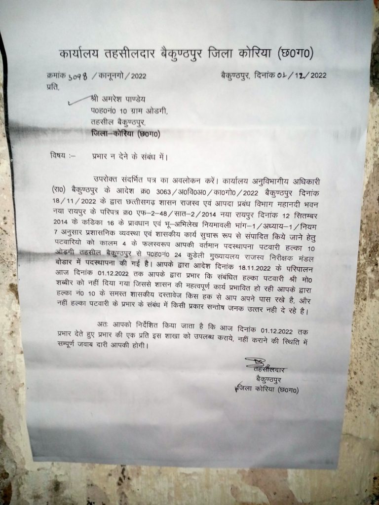 विदित हो कि गुरुवार को तहसील कार्यालय का कर्मचारी पटवारी को नोटिस देने गया तो पटवारी का आफिस बंद मिला, ऐसे में कर्मचारी ने पटवारी के आफिस में नोटिस चस्पा कर लौट आया। तहसीलदार बैकुंठपुर के द्वारा 1 नवंबर 2022 को पटवारी अमरेश पांडे पटवारी हल्का नंबर 10 ग्राम ओड़गी तहसील बैकुंठपुर को प्रभार देने के संबंध में चेतावनी पत्र देते हुए कहा गया कि छत्तीसगढ़ शासन के 12 सितंबर 2014 के कंडिका 16 के प्रावधान एवं भू अभिलेख नियमावली के अनुसार प्रशासनिक व्यवस्था एवं शासकीय कार्य सुचारू रूप से संपादित किए जाने के लिए पटवारी हल्का 10 ओडगी तहसील बैकुंठपुर से पटवारी हल्का नंबर 24 कुडेली दिनांक 18 नवंबर 2022 के आदेष परिपालन में दिनांक 1 नवंबर 2022 तक आपके द्वारा प्रभार कि संबंधित हल्का पटवारी मोहम्मद शब्बीर को नहीं दिया गया । जिससे शासन के महत्वपूर्ण कार्य प्रभावित हो रहे हैं आपके द्वारा हल्का नंबर 10 के समस्त शासकीय दस्तावेज की सबसे आपने अपने पास रखे हैं ।