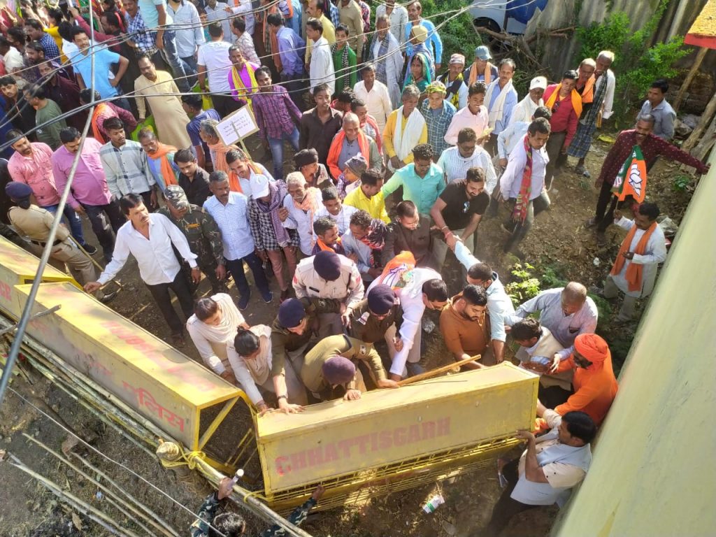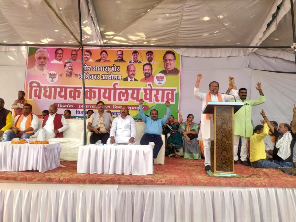 मोर आवास मोर अधिकार अभियान अंतर्गत बैकुन्ठपुर विधायक अम्बिका सिंहदेव के कार्यालय का घेराव एवं आमसभा का आयोजन पूर्वगृह मंत्री राम सेवक पैकरा, पूर्व केबिनेट मंत्री भईयालाल राजवाड़े के उपस्थिति में एवं भाजपा जिला अध्यक्ष कृष्ण बिहारी जायसवाल के नेतृत्व में हुआ। इससे पूर्व नये नगर पालिका काम्पलेक्स में बड़ी संख्या में भाजपा के पदाधिकारी इक्टठा हुए और कांग्रेस व स्थानिय विधायक के खिलाफ जमकर गरजे। इस अवसर पर कार्यकर्ताओं को संबोधित करते हुए रासेवक पैकरा ने कहा कि अम्बिका सिंहदेव को जिताकर बैकुन्ठपुर की जनता अब पछता रही है। गरीबों का आवास छीनने वाली भूपेश सरकार और उसके ऐसे विधायको को जाने से अब कोई नहीं रोक सकता। मोर आवास मोर अधिकार कार्यक्रम में आये सभी लोग का धन्यवाद । आप बताओ कि भैया लाल ने अपने मंत्री काल में अपने सरकारी आवास को ही धर्मशाला बना दिया था। आजके सरकार के एक भी विधायक बताये कि उन्होने अपनी जेबे भरने के अलावा क्या किया । क्यो नही इनका एक भी मंत्री लोगो का इलाज करवा पा रहा है। हममें हमेसा सेवा भाव था। उन्होने कहा कि जो गड़बड़ करता है वो ही हाथ जोड़ता हैं । तो ये लोग हाथ जोड़ अभियान कर रहे गांव गांव में। किसान को धान बेचने के लिए बोरा तक नही दे पाई ये सरकार । बीते चुनाव में लोग इनके धोखा में फंस गए, हमारी सरकार ने 15 साल में पंचायत में महिलाओं को 50 प्रतिशत अधिकार दिलाया था।