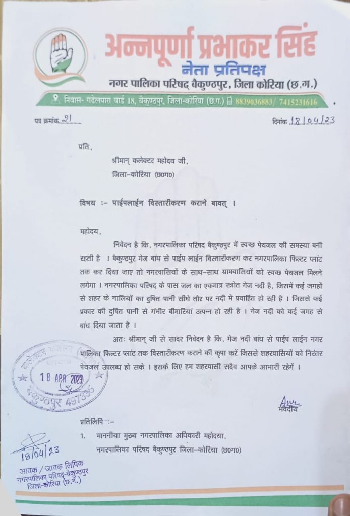 इस कार्य में सभी का सहयोग मिले राजनीति से परे हटकर हम सब पेयजल की समस्या के निदान के लिए सहयोग प्रदान करें। बैकुंठपुर नगर पालिका में प्रतिदिन कई जगहों से शहर से निकलने वाला गंदा पानी सीधे तौर पर नदी में प्रवाहित हो रहा है पाइप लाइन से आ रही है दुर्गंध युक्त पानी जिसको ग्रहण करने से मानव शरीर में कई प्रकार की गंभीर बीमारियां उत्पन्न हो रही है ऐसा कार्य योजना बनाना चाहिए कि नगर वासियों को दोनों टाइम प्रतिदिन स्वच्छ साफ पेयजल मिल सके।