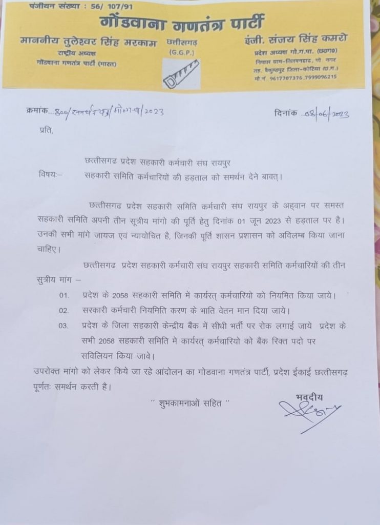 छत्तीसगढ़ प्रदेश सहकारी कर्मचारी संघ को समर्थन देने संजय कमरो गोंडवाना गणतंत्र पार्टी के प्रदेश अध्यक्ष के द्वारा समर्थन देने जिला सूरजपुर धरना स्थल पर पहुंचे । इस दौरान छत्तीसगढ़ प्रदेश सहकारी समिति के अध्यक्ष प्रभाकर सिंह, जिला सूरजपुर अध्यक्ष अशोक साहू, जिला उपाध्यक्ष रविंद्र गुर्जर, सचिव तनवीर आलम, शंकर लाल साहू, कोषाध्यक्ष विनय सिंह, मनोहर कुशवाहा, संभाग उपाध्यक्ष सनलित कुमार कुशवाहा एवं समिति कर्मचारी सोहराब अंसारी राजेश साहू, सुजीत गुप्ता, मोहन राजवाड़े, सुनील कुशवाहा, मेहंदी सत्यस्वर साहू, हसन, सीताराम राजवाड़े, विभु सिंह, ठाकुर सिंह मरावी एवं जिला के समस्त कर्मचारी उपस्थित थे।
