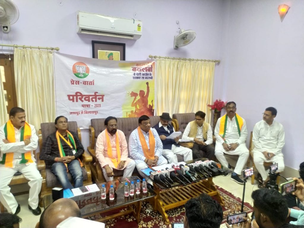 छत्तीसगढ समेत 4 राज्यों के आगामी नवम्बर के अंत में होने जा रहे विधानसभा चुनाव में सत्ता में वापसी की कोशिश में लगी बीजेपी राज्य में परिवर्तन यात्रा पर है। जशपुर से निकली बीजेपी की परिवर्तन यात्रा 19 सितम्बर की शाम कोरिया जिला मुख्यालय बैकुन्ठपुर पहुॅचे। वही पर आज बुद्धवार को सुबह छत्तीसगढ नेता प्रतिपक्ष नारायण चंदेल ने पीडब्लूडी रेस्ट हाउस में प्रेस कॉन्फ्रेंस कर कांग्रेस पर जमकर निशाना साधा। इस दौरान नारायण चंदेल के साथ पूर्व राज्यसभा सदस्य रामविचार नेताम और बीजेपी प्रदेश प्रवक्ता अनुराग सिंह देव, पूर्वमंत्री भैयालाल राजवाडे, पूर्व मंत्री राम विचार नेताम, ओ पी चौधरी, प्रदेश प्रवक्ता नललिश टोकने भी मौजूद रहे। इस प्रेस कॉन्फ्रेंस में चंदेल ने राज्य की कांग्रेस सरकार और उनके मंत्रियों पर भ्रष्टाचार के गंभीर आरोप लगाए।