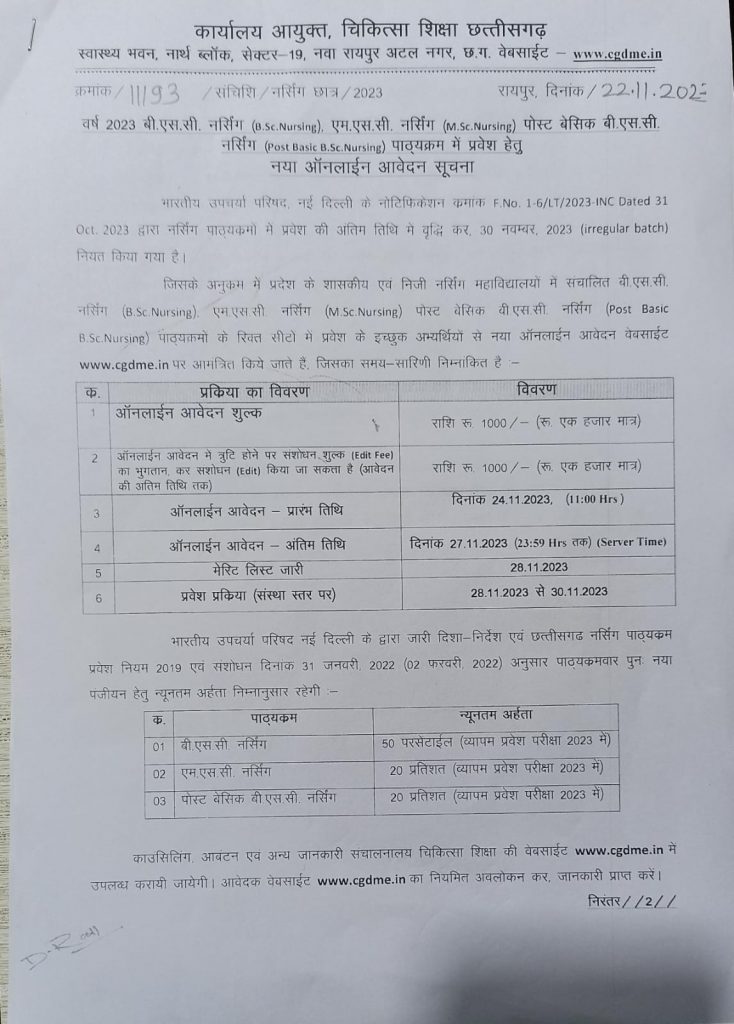 वर्तमान में हायर सेकेण्डरी षिक्षा उपरांत बायोलॉजी संकाय के विद्यार्थियों हेतु 04 वर्षीय बीएससी नर्सिंग कोर्स किया जा सकता है। बीएससी नर्सिंग हेतु बायोलॉजी संकाय विषय अनिवार्य है। शासन के नियमानुसार आरक्षित वर्ग को प्रवेश हेतु 12वीं के प्राप्तांक में छूट प्रदान है। नर्सिंग कोर्स हेतु आयु 17 वर्ष से 35 वर्ष होना अनिवार्य है। बीएससी नर्सिंग कोर्स में प्रवेश हेतु व्यापम द्वारा आयोजित पीएनटी (प्री नर्सिंग टेस्ट) में उत्तीर्ण होना अनिवार्य है। इस वर्ष व्यापम द्वारा 24 जून 2023 दिन शनिवार को बीएससी नर्सिंग में प्रवेश हेतु चयन परीक्षा छत्तीसगढ़ के सभी जिलों में आयोजित की जा चुकी है।
