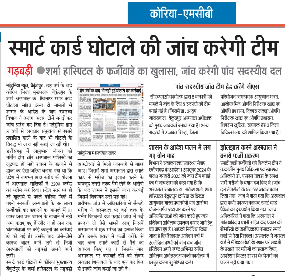 स्मार्टकार्ड घोटाले की चल रही जॉच……अब अस्पताल को चाहिए आयुष्मान योजना का लाभ