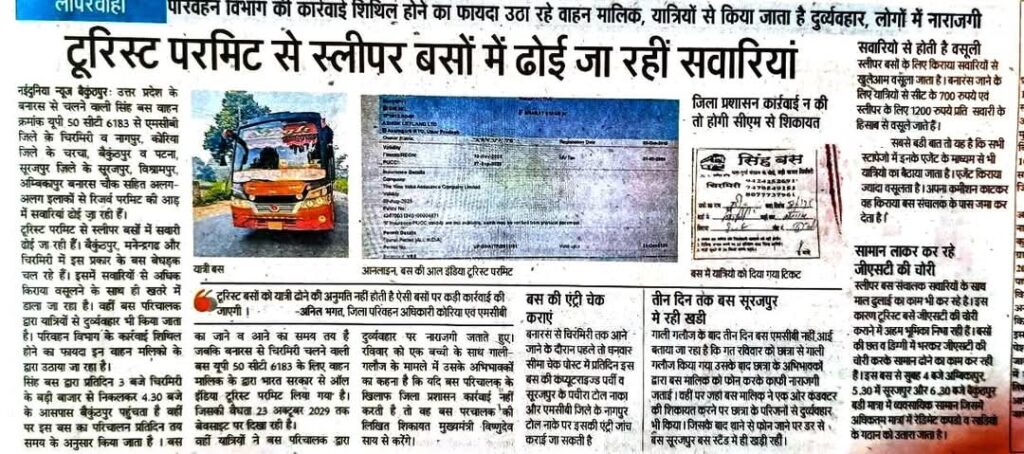 सरगुजा संभाग के अधिकारियो पर उठे सवाल…टूरिस्ट परमिट पर प्रतिदिन उत्तरप्रदेश जाने वाली बसो पर कार्यवाई नही